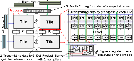为应对上述挑战,中国科学院微电子研究所集成电路制造技术全国重点实验室科研团队设计了一种高能效、高利用率注意力加速器硬件架构。该架构采用内外积混合的 “平衡脉动阵列”(Balanced Systolic Array)结构。团队基于数据复用理论公式指导,确定最佳的内外积混合阵列形状,其能效相比传统脉动阵列提升了40%,利用率达99.5%。在操作流程上,团队提出了“多行交织”(Multi-Row Interleaved)的操作顺序,使 SRAM 能耗降低了 31.7%。基于上述两种技术,团队设计的注意力加速器在能效方面提升了39%,在吞吐量×能效方面较现有工作提升了38%。