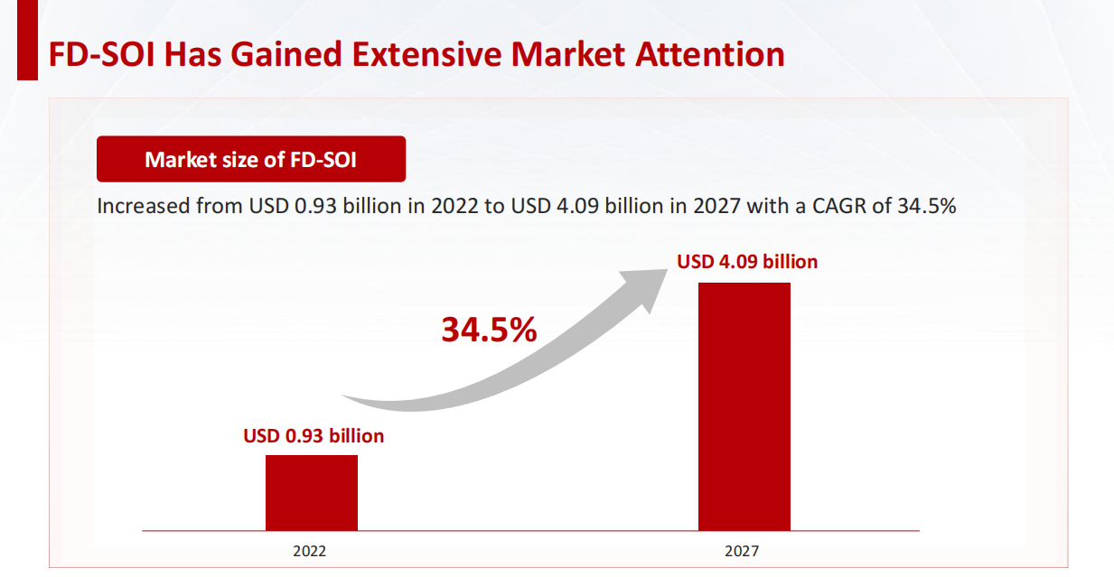 戴伟民博士在致辞中回顾了FD-SOI技术的多个里程碑事件,以及芯原股份作为技术见证者连续多年举办FD-SOI论坛的产业视角。其指出,随着全球对低功耗、高性能芯片需求的不断增长,FD-SOI 技术有望在多个领域发挥关键作用。而FD-SOI市场规模预计也将从2022年的9.3亿美元增长至2027年的40.9亿美元,CAGR达34.5%!