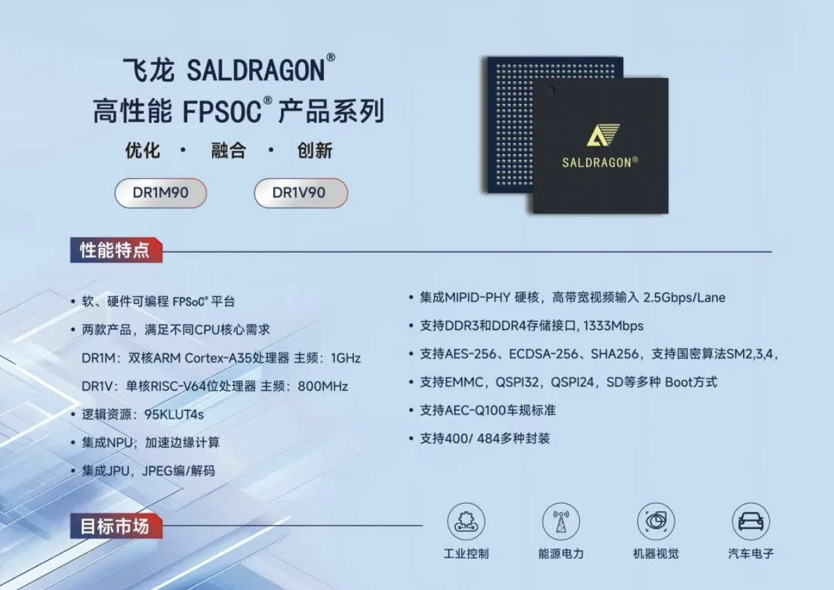 DRAGON1家族定位复杂嵌入式系统、低功耗和高性能芯片市场,产品集成FPGA可编程逻辑单元阵列、硬核处理器系统、运算加速引擎,产品集成单核64位RISC-V或双核ARMCortex-A35等高性能硬核处理器,具有专属MIPI高速视频接口、DDR3\DDR4高速存储接口,支持千兆以太网,配套公司自主开发的嵌入式软件SDK、集成开发环境工具,能够满足工业等应用领域对计算能力、可扩展性、实时性、稳定性等方面的高要求,为工业机器人、电力控制、通信设备等场景提供高性能、低功耗的解决方案,大幅缩短客户开发周期,助力“中国智造”向高端化跃迁。
