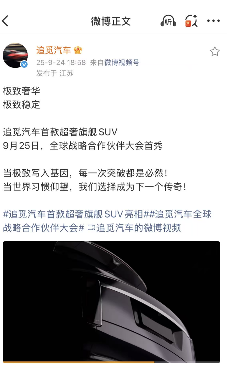 9月24日,追觅汽车今日透露,旗下第二款车辆产品将在9月25日举行的首届全球战略合作伙伴大会上首秀。从外形来看,新车酷似劳斯劳斯库里南,官方定位为家族首款超奢旗舰SUV。官方表示, “性能纯电轿跑+超奢旗舰SUV” 的多产品矩阵将互补,覆盖不同高端细分市场需求。据悉,两款产品计划在2027年上市。