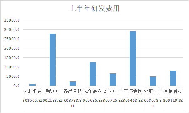 从今年上半年研发费用来看,上半年三环集团研发投入29263.6万元稳居第一,顺络电子研发投入27730.2万元位居第二,风华高科研发投入12401.5万元位居第三,麦捷科技研发投入为8180.9万元,宏达电子研发投入为6734.1万元,火炬电子研发投入为5014.4万元,泰晶科技研发投入为2292.78万元,达利凯普研发投入为930.1万元。