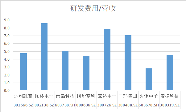 从2025年上年报研发费用占营收比例来看,顺络电子位居第一达8.6%,宏达电子位居第二达7.9%,三环集团位居第三达7.1%,泰晶科技为5%,达利凯普为4.8%,麦捷科技为4.6%,火炬电子为2.8%。