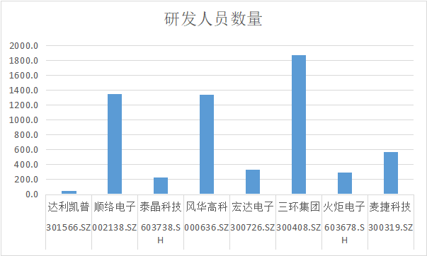 从研发人员数量来看,三环集团研发人员数量稳居第一达1877人,顺络电子研发人员数量位居第二达1354人,风华高科研发人员数量位居第三达1336人,麦捷科技研发人员数量为568人,宏达电子研发人员数量为336人,火炬电子研发人员数量为296人,泰晶科技研发人员数量为227人,达利凯普研发人员数量为46人。