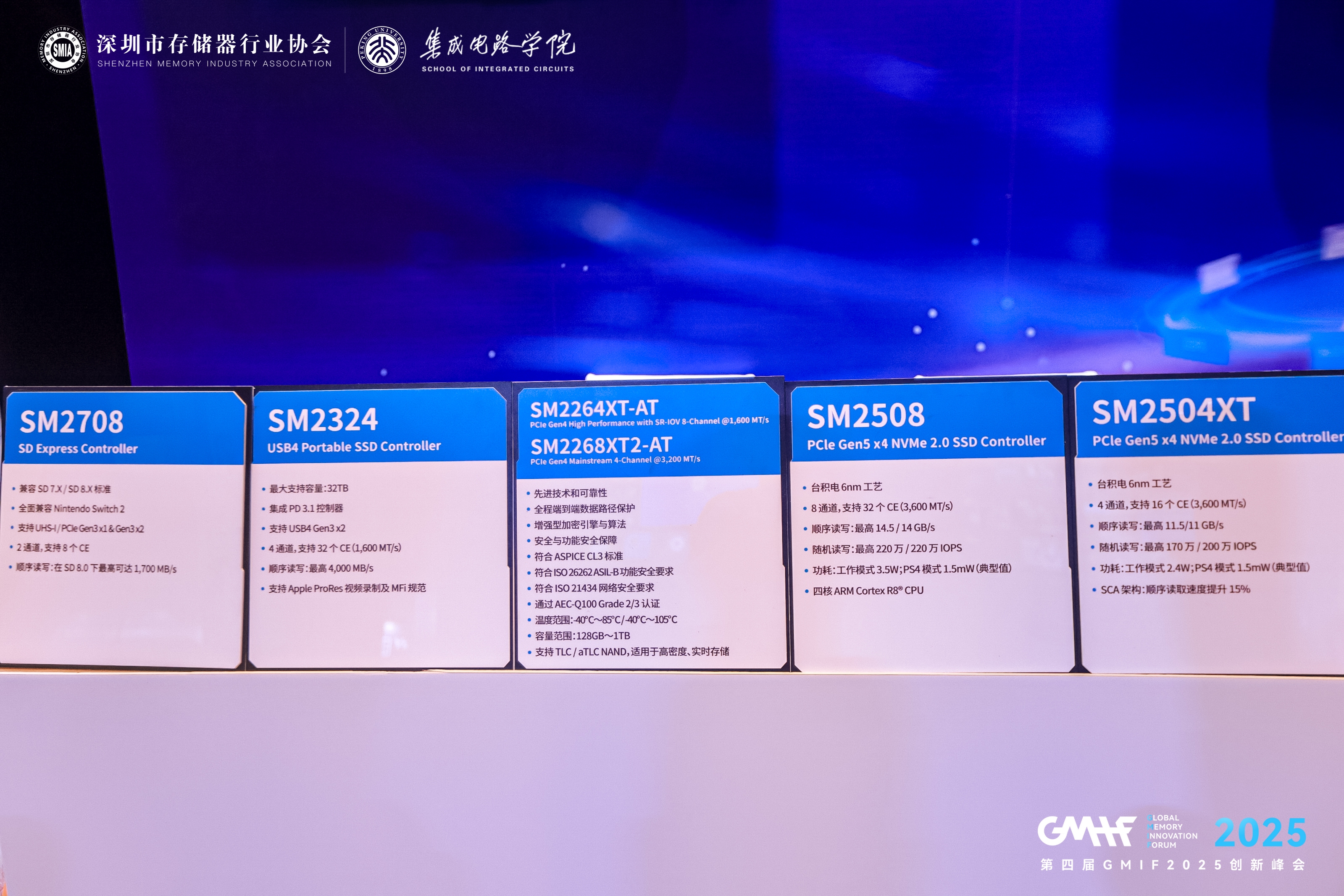 慧荣科技此次重点展示了SM2504XT主控芯片,这款产品此前被定位为“支持AI PC的下一代旗舰主控”。此外,展台桌面还陈列了多款针对不同场景,如企业级存储、移动存储等的主控芯片方案展板,展示了其高性能存储解决方案的技术亮点,整体围绕AI时代存储性能突破与全场景存储适配展开。