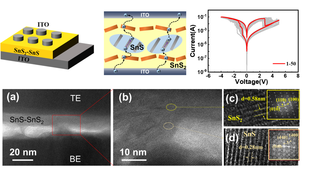 随着人工智能和大数据的快速发展,传统计算架构在能耗与处理效率方面面临瓶颈。忆阻器作为新一代存储与类脑计算的核心器件,因具备存算一体、多级存储及类突触可塑性等优势,成为国际研究热点。然而,实现性能稳定且可规模化制备的忆阻器仍是亟待突破的难题。针对这一问题,研究团队提出了一种液相低温制备SnS/SnS₂复合二维薄膜的新方法,在薄膜中引入垂直取向的SnS纳米域,从而有效调控硫空位的分布和迁移通道。该独特结构显著改善了忆阻器件的电阻切换稳定性和能效表现,为二维材料在神经形态计算中的大规模应用提供了新的思路,对未来低功耗、高效率的类脑芯片研发具有重要意义。