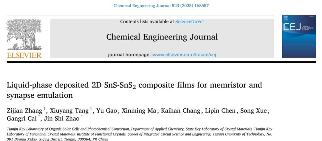近日,天津理工大学赵金石教授团队在国际顶尖学术期刊《Chemical Engineering Journal》(影响因子约13.2,中科院工程技术大类1区Top期刊)发表了最新研究成果《Liquid-phase deposited 2D SnS-SnS₂ composite films for memristor and synapse emulation》。该工作围绕新一代类脑计算器件的关键科学问题——如何在二维材料忆阻器中实现电荷传输与突触可塑性的协同调控,提出了全新的“相位工程+垂直取向结构”设计策略。