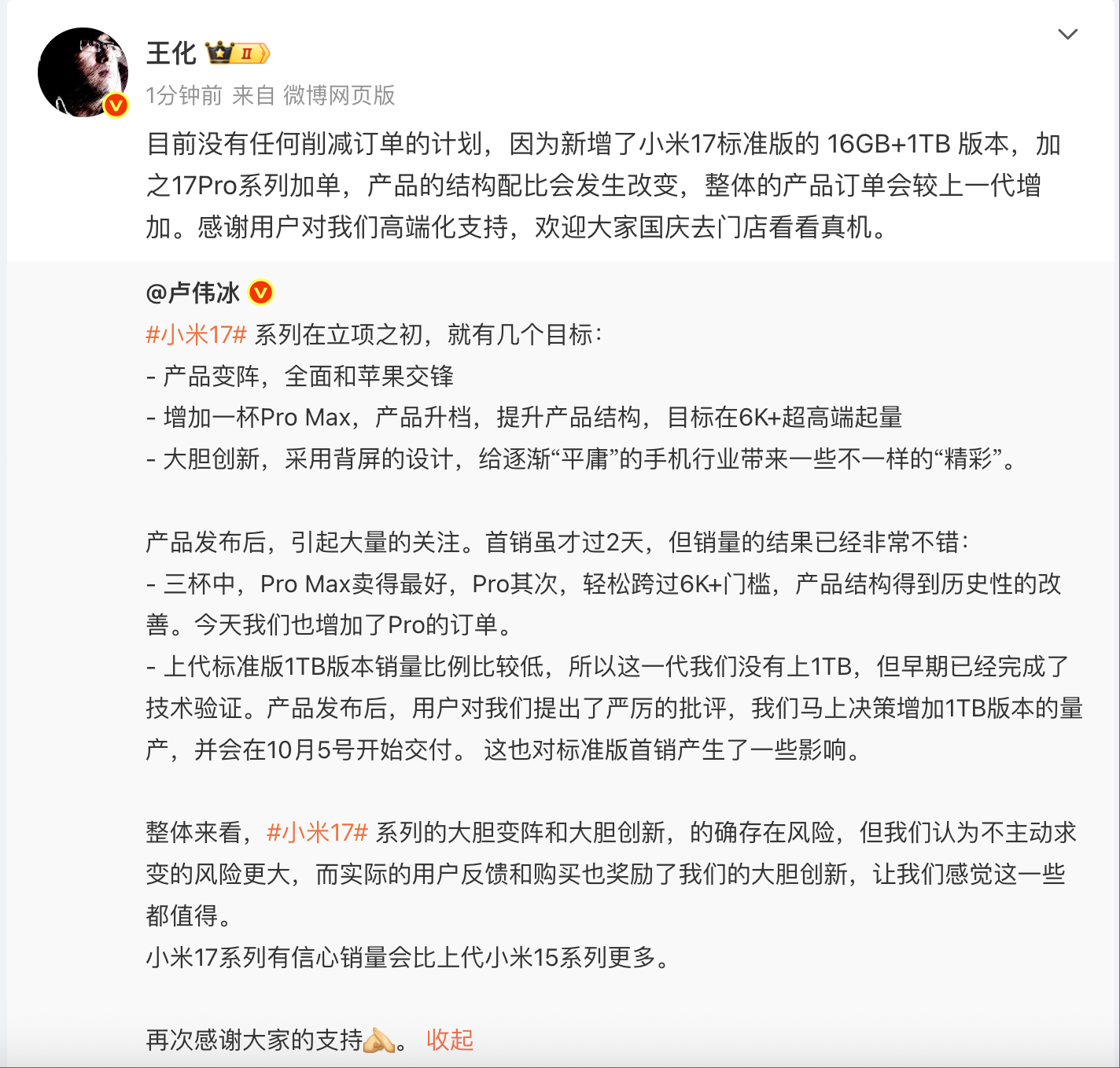 9月29日,小米公关负责人王化发文称,目前没有任何削减订单的计划,因为新增了小米17标准版的16GB+1TB 版本,加之17 Pro系列加单,产品的结构配比会发生改变,整体的产品订单会较上一代增加。