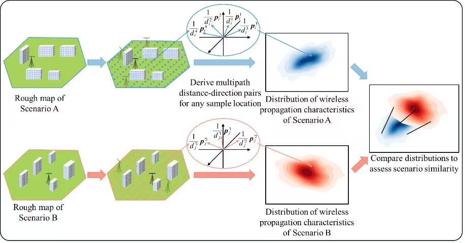 将无线AI模型从特定场景推广至更广泛的区域具有重要意义,这通常需要大规模扩展训练数据,会带来难以承受的数据采集与模型训练成本,如何获取有效数据样本、降低数据规模、减少测量和训练代价是当前无线AI面临的重要课题。论文提出了一种无需事先测量的场景相似性评估与数据规模缩减方法。该方法利用公开的粗略场景地图,结合电磁传播物理规律构建场景相似性度量,据此选择代表性场景构建多样性充分的数据集,从而高效缩减数据规模和训练成本,如下图所示。