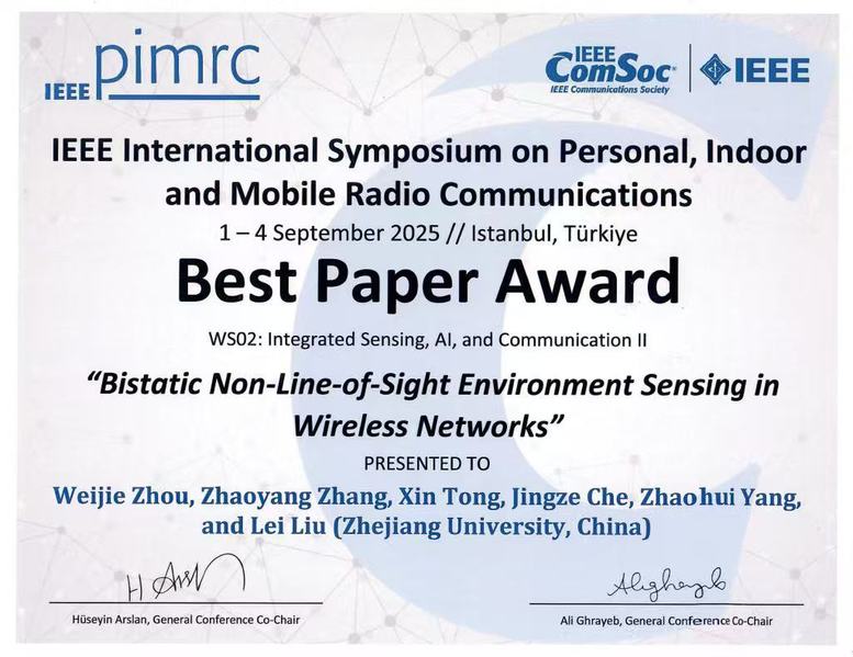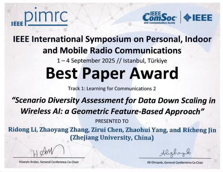 2025年9月1日至4日,2025年度IEEE个人、室内和移动无线通信国际会议(PIMRC 2025)在土耳其伊斯坦布尔举行。我院博士生黎日东、硕士生周伟杰(导师均为张朝阳教授)宣读的两篇论文同时获得最佳论文奖。