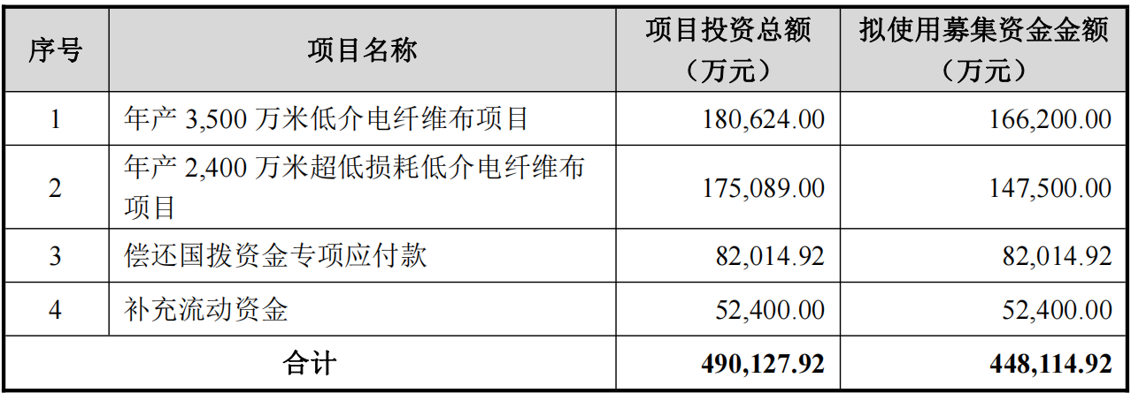 募集资金将主要用于以下项目:年产3,500万米低介电纤维布项目(拟投入166,200万元)、年产2,400万米超低损耗低介电纤维布项目(拟投入147,500万元)、偿还国拨资金专项应付款(82,014.92万元)以及补充流动资金(52,400万元)。上述项目合计投资总额为490,127.92万元。