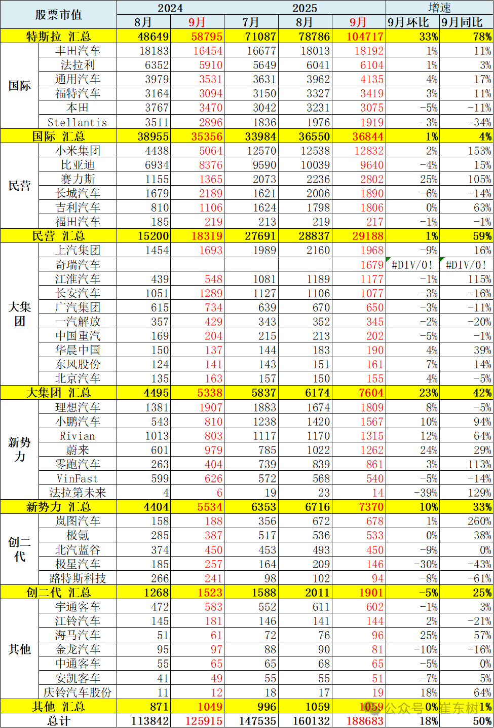 崔东树最新文章引用乘联会数据显示,2025年9月汽车整车上市公司市值变化显著,新能源车企业仍为核心增长动力,但燃油车企的市值改善也呈现积极趋势。美股市场的整车企业市值规模最大,达到14.8万亿元,港股市场达到3万亿元,国内A股市场则为8400亿元。