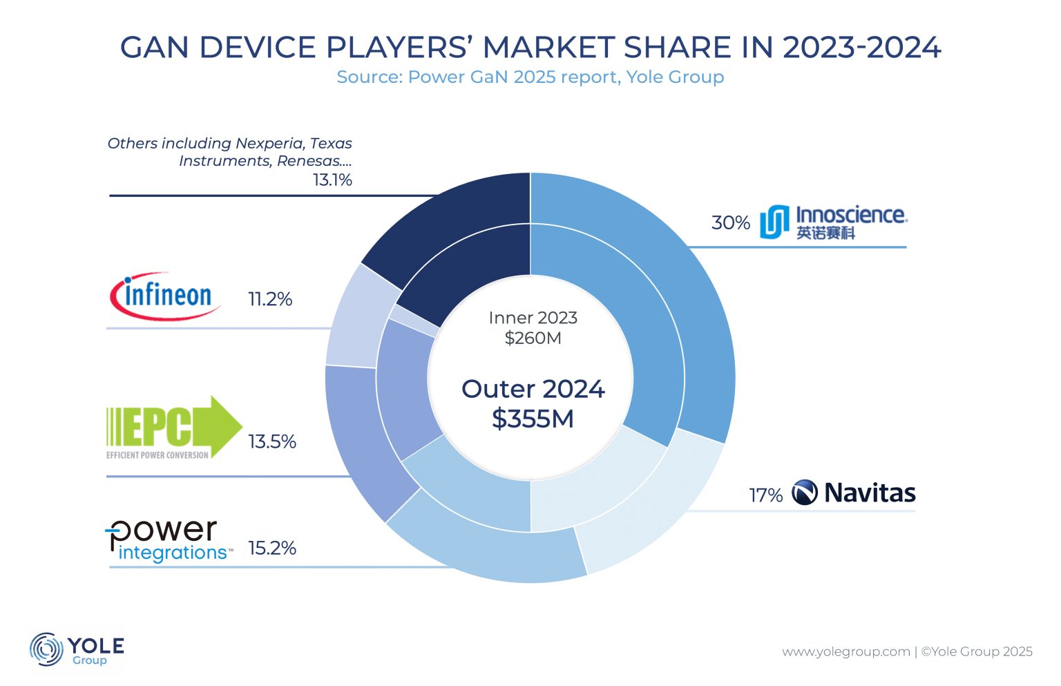英诺赛科(Innoscience)以2024年30%的市场份额保持领先,得益于在快速充电器、汽车、数据中心和家用电器领域的设计胜利。此外,该公司还开发外延晶圆,加强垂直整合,并在中国的活跃度极高,同时通过与意法半导体(STMicroelectronics)的合作扩展海外市场。