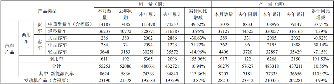 另需说明的是,福田戴姆勒与福田康明斯均为北汽福田持股50%的合资公司。其中,福戴重型货车9月销量9,925辆,1-9月累计销量74,965辆,累计同比增长73.9%;福康发动机9月销量15,410台,1-9月累计销量133,944台,累计同比增长12.98%。