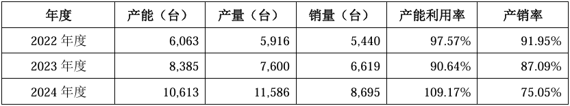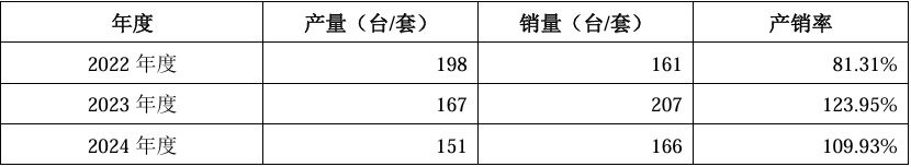 真空科学仪器设备产品主要面向高校、科研院所等科研单位,市场需求相对有限,导致其产量及销量长期处于低位水平:2022年198台产量、161台销量(产销率81.31%),2023年167台产量、207台销量(产销率123.95%,消化库存),2024年151台产量、166台销量(产销率109.93%),但2022年-2024年产量逐年下降。