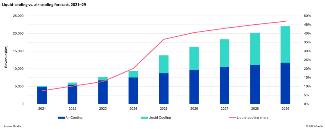 Omdia发布的最新调研数据显示,2024年,全球数据中心液冷市场增长率达96%,超越了19亿美元的市场门槛。单相冷板式液冷(1-P DtC)市场在2024年实现150%的增长,主要得益于人工智能数据中心对该技术的广泛采用。2025年,超高密度AI机架(如NVL72)的大规模出货将再次催生液冷解决方案的需求高峰。