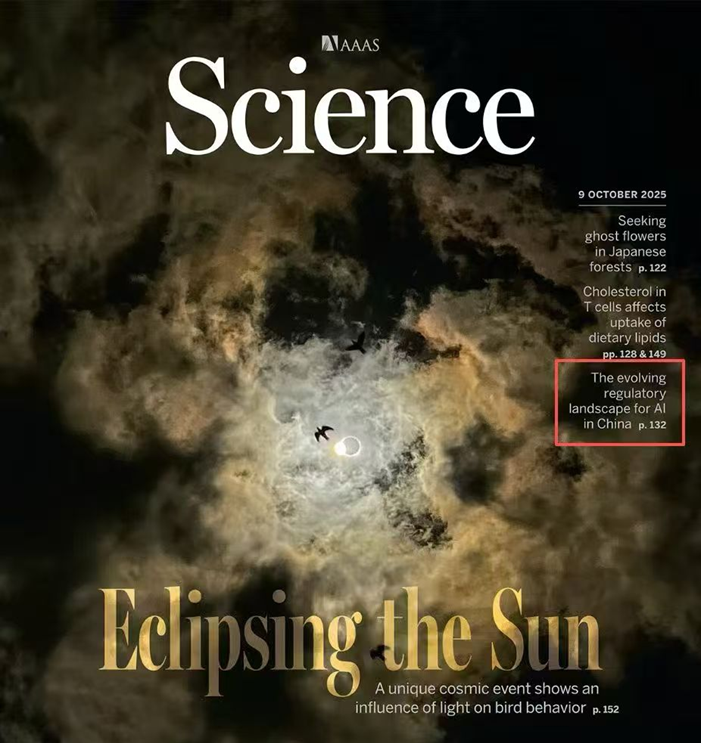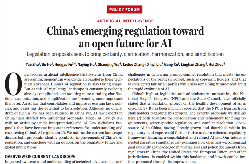 近日,国际顶尖学术期刊《科学》(Science)在线发表了中国信息通信研究院(简称“中国信通院”)何波、呼娜英与同济大学助理教授朱悦等合作者的研究论文,题为《中国人工智能监管创新 推动迈向开放未来》(China’s Emerging Regulation Towards an Open Future for AI)。该论文也是《科学》杂志当期封面文章,深入分析了我国人工智能法律制度和监管实践对人工智能开源发展以及风险防控的促进作用,积极宣介了我国人工智能法治建设的最新进展和成效经验,并提出了我国人工智能健康发展立法的方向,为全球人工智能治理法治化贡献智慧。