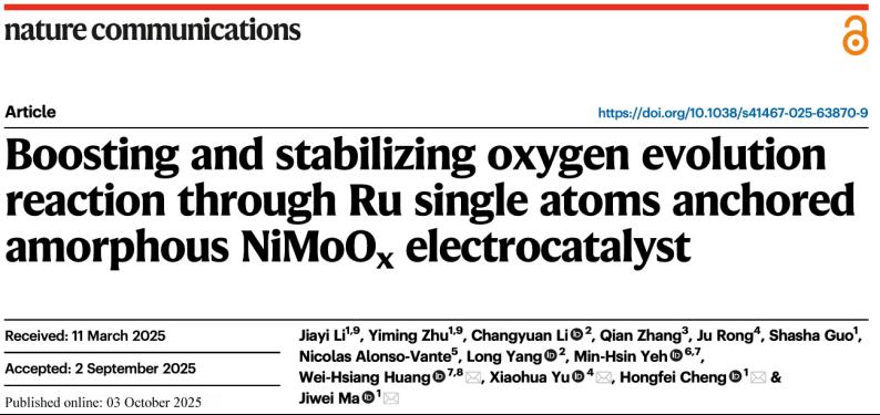 10月3日,《自然·通讯》(Nature Communications)在线发表了同济大学材料科学与工程学院马吉伟教授团队及其合作者的研究论文“Boosting and stabilizing oxygen evolution reaction through Ru single atoms anchored amorphous NiMoOx electrocatalyst”。该研究构建了一种以非晶NiMoOx为载体锚定Ru单原子的电催化材料,为在非晶氧化物上锚定金属单原子设计高性能OER电催化剂提供了范式与依据。