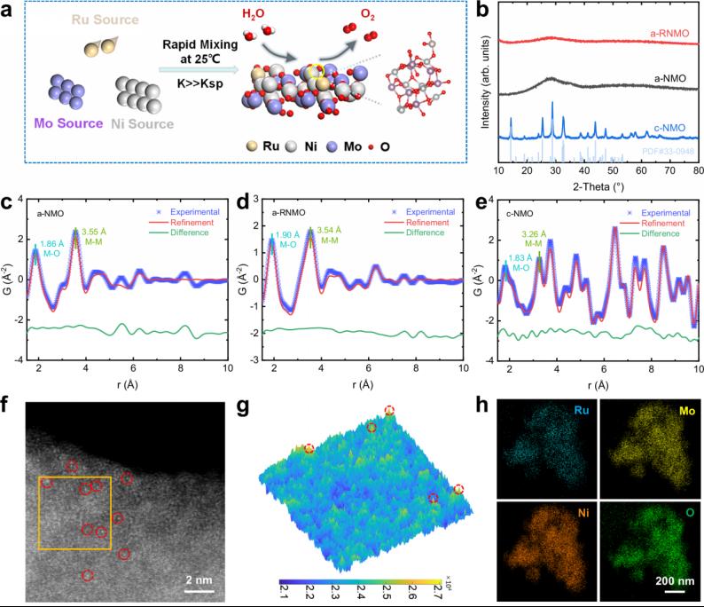 针对以上问题,马吉伟团队设计了一种室温下一步过饱和共沉淀法得到锚定Ru单原子的非晶NiMoOx,该催化剂在碱性电解槽中展现出优异的应用潜力。原位表征和理论计算表明,单原子和非晶结构在电催化反应中起着至关重要的协同作用。以上研究验证了在非晶材料中锚定贵金属单原子,为贵金属催化剂取得高催化性能和经济效率之间的平衡提供了前瞻性策略。