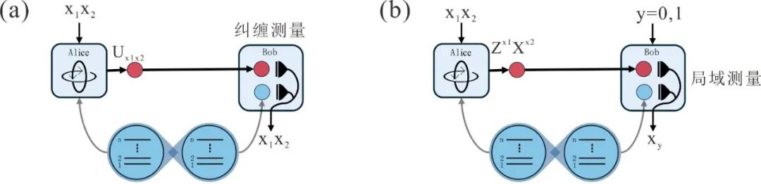 ▲(a) 量子密集编码和 (b) 基于纠缠的随机通信框架原理示意图