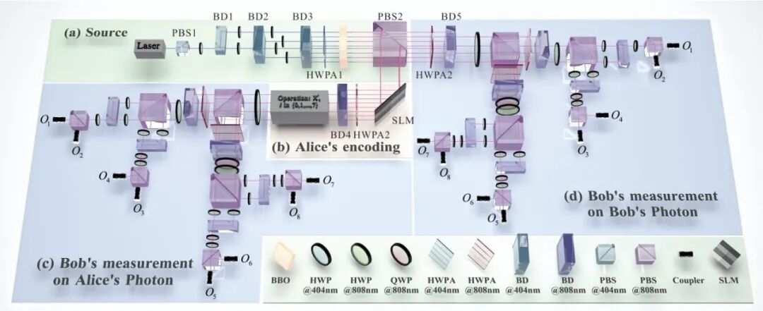 在实验设计中,团队采用光学系统,通过自发参量下转换过程生成八维的“默契卡片”。团队利用光子的路径和偏振自由度进行混合编码,形成4×2的八维空间,这降低了操作和测量高维量子态的难度。发送端将两位信息编码到量子态中,并通过八维量子信道发送。进而,接收端随机选择想要读取的线索类型。