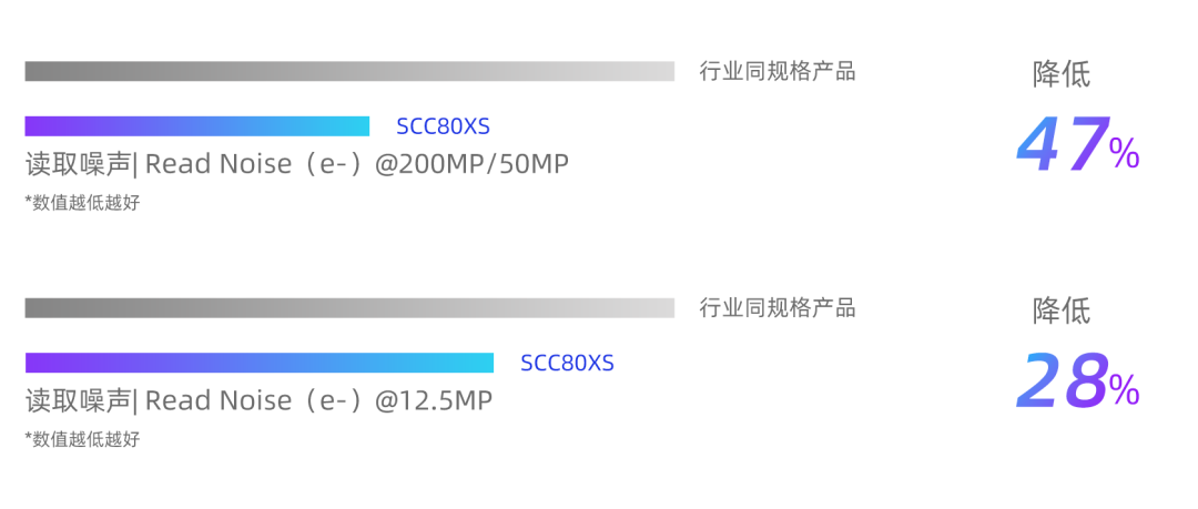 SCC80XS拥有2亿超高清像素,支持传感器内2倍(50MP)及4倍(12.5MP)变焦,可实现全焦段高清拍摄。其创新的SFCPixel®-SL技术大幅降低了噪声,在200MP及50MP模式下,读取噪声仅约0.7e-,较行业同规格产品降低约47%;12.5MP模式下,读取噪声仅约1.2e-,降低约28%,显著提升夜景成像质感。