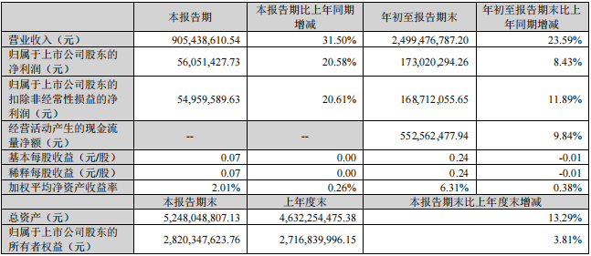 报告期内,公司整体业绩表现亮眼。年初至报告期末,实现营业收入24.99亿元,同比增长23.59%;归属于上市公司股东的净利润1.73亿元,同比增长8.43%;归属于上市公司股东的扣除非经常性损益的净利润1.69亿元,同比增长11.89%。经营活动产生的现金流量净额达5.53亿元,同比增长9.84%,现金流健康度良好。