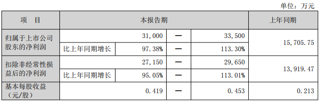 1、归属于上市公司股东的净利润:预计实现31000万元至33500万元,较上年同期的15705.75万元增长97.38%至113.30%,盈利规模实现近翻倍增长;
