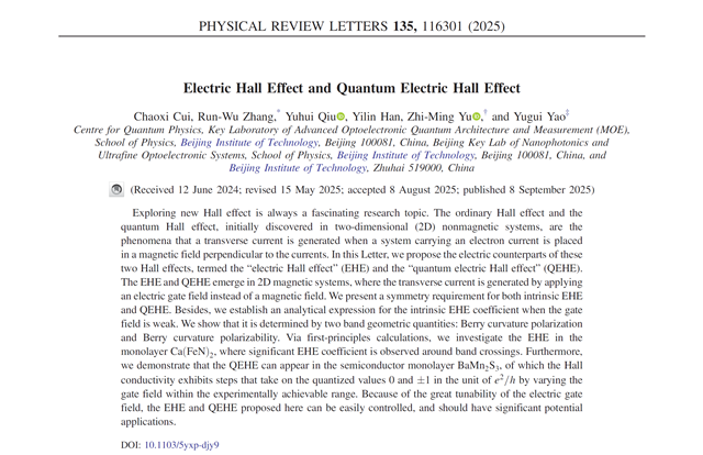 近日,北京理工大学物理学院姚裕贵教授团队基于电场对贝里曲率和能带结构的调控,提出霍尔效应的“电场版本”,即电霍尔效应和量子电霍尔效应。该团队通过对称性分析,明确了实现这些全新效应的对称性条件,发现该效应可以广泛存在于铁磁性、反铁磁性和交错磁性等二维材料体系中。此外,应用微扰理论和半经典输运方程,推导出内禀电霍尔电导率的解析表达式,明确指出内禀电霍尔效应来源于两种全新的几何量——贝里曲率极化与贝里曲率关于垂直电场的极化率。该工作以“Electric Hall Effect and Quantum Electric Hall Effect”为题发表于国际物理学顶级期刊《Physical Review Letters》。北京理工大学为该工作的唯一完成单位,张闰午特别研究员、余智明教授和姚裕贵教授为论文的共同通讯作者,博士生崔朝喜为论文的第一作者,博士生邱宇辉、韩依琳为论文的共同作者。该工作得到科技部重点研发计划和国家自然科学基金等项目的支持。
