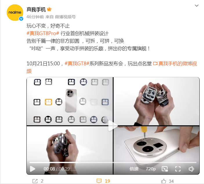 真我官方发布视频,介绍新机GT8 Pro可以将不同样式的摄像头模组进行机械拼装,打造成个人的专属旗舰。官方称“告别千篇一律的非方即圆 ,可拆,可拼,可换”。