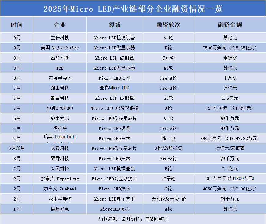 2025年以来,全球Micro LED产业链融资活动持续活跃,覆盖设备、微显示、AR眼镜、芯片技术等多个关键领域。多家企业在不同轮次中获得资金支持,显示出资本市场对Micro LED技术发展前景的持续看好。