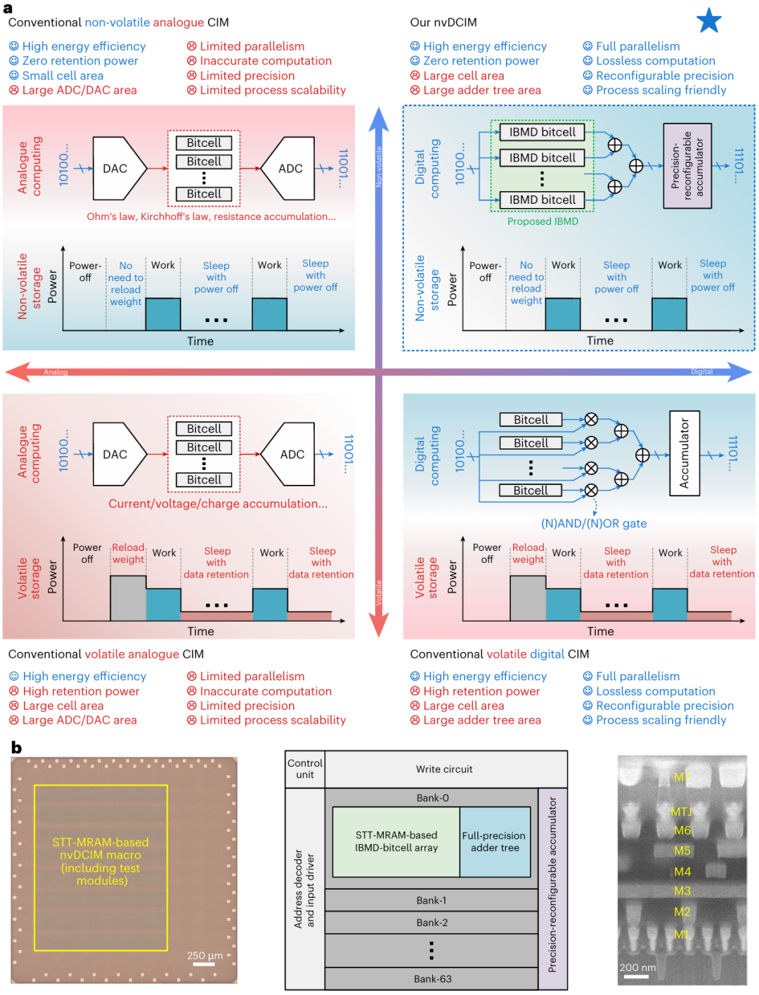 近日,南方科技大学深港微电子学院林龙扬课题组在非易失存算一体芯片领域取得重要研究进展。团队基于40纳米CMOS及STT-MRAM工艺,提出并流片验证了首个精度无损、全并行的数字式非易失存算一体芯片(nvDCIM, non-volatile Digital Compute-in-Memory),系统性解决了传统模拟式存算一体芯片在计算精度、可扩展性与鲁棒性上的瓶颈,并提出基于翻转率感知的网络训练方法以提升存算一体芯片在人工智能应用的能效。相关研究成果以“A lossless and fully parallel spintronic computeinmemory macro for artificial intelligence chips”为题发表于Nature Electronics(DOI:10.1038/s41928-025-01479-y)。研究由南方科技大学联合西安交通大学等单位共同完成,南方科技大学为论文第一单位和通讯单位。南方科技大学林龙扬助理教授、西安交通大学闵泰教授为论文的通讯作者。南方科技大学林龙扬课题组2024级博士研究生李瑚淼(南科大2018级本科毕业生,2022级硕士研究生)为论文的第一作者。