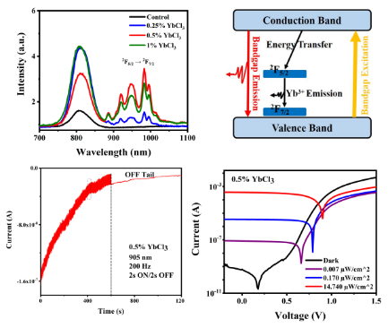 研究团队提出一种基于镱掺杂技术的波长调控的双模式钙钛矿光电探测器,将传统传感功能与新型神经响应集成于单一平台。通过精准调控掺杂浓度,优化了材料的结晶度、载流子传输效率及电荷动态特性。该器件在近红外光波段呈现类似神经形态系统的自适应响应特性,同时在可见光波段保持了传统光电探测能力。该成果展现了镱掺杂技术在构建智能光电子器件方面的潜力,为未来神经形态计算与视觉传感应用提供了重要技术支撑。