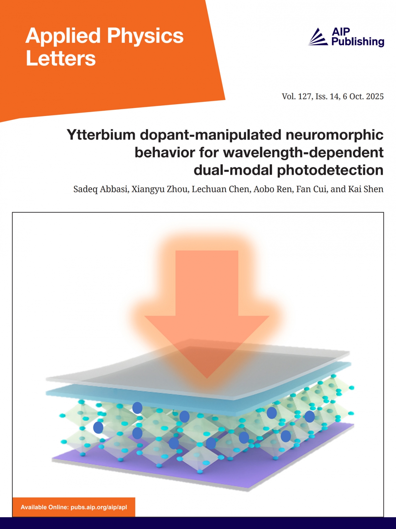 近日,电子科技大学基础与前沿研究院巫江教授团队在《应用物理快报》(Applied Physics Letters)杂志上发表题为“Ytterbium Dopant-Manipulated Neuromorphic Behavior for Wavelength-Dependent Dual-Modal Photodetection”的研究论文,并被选取为期刊亮点封面,对新一代多模式光电器件设计提供了创新思路。基础与前沿研究院博士后Sadeq Abbasi为论文第一作者,任翱博研究员和沈凯副研究员为共同通讯作者,电子科技大学基础与前沿研究院为论文第一单位。