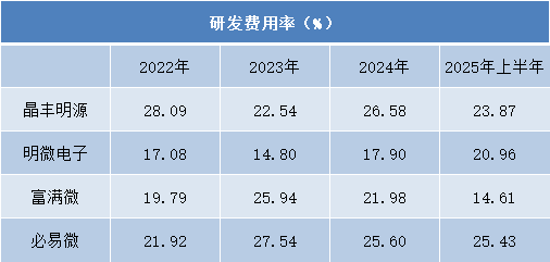 从研发费用率来看,各企业普遍保持在较高水平。必易微的研发费用率连续四年超过21%,2023年更达到27.54%;晶丰明源的研发费用率始终处于行业高位,2025年上半年仍达到23.87%。