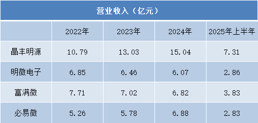 相比之下,明微电子与富满微的营收在此期间呈现小幅下滑趋势。明微电子从2022年的6.85亿元逐步回落至2024年的6.07亿元;富满微亦从7.71亿元降至6.82亿元,2025年上半年分别为2.86亿元与3.83亿元,反映出其在部分细分市场面临压力。