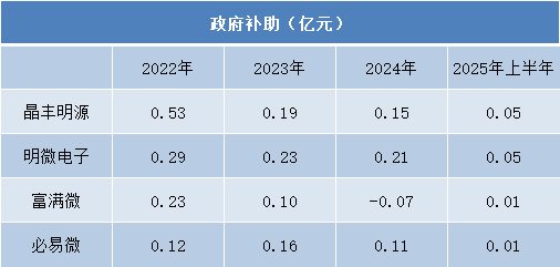 值得关注的是,富满微在2024年出现政府补助为负的情况,2025年上半年也仅获0.01亿元补助,反映出其外部支持力度已十分有限。