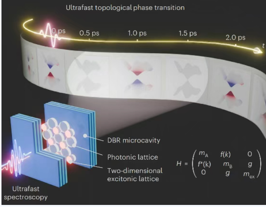 激子极化激元是光与固态半导体中的激子强耦合形成的半光-半物质准粒子。它同时具备光子系统的高设计自由度和电子体系强而丰富的粒子间相互作用,因而有望用于构筑超紧凑、超高速的可重构片上光子器件。研究团队将图案化的单层二维半导体与谷霍尔光子晶体强耦合,构建出具有亚晶格对称破缺的激子极化激元超晶格。基于激子漂白效应,团队通过飞秒激光脉冲超快调控激子-光子耦合强度,并结合角分辨泵浦探测技术,在0.5皮秒内实现了极化激元拓扑相变。研究团队同时还建立了非线性光子-激子耦合理论模型,准确预测并验证了瞬态能带结构及其拓扑性质的动态演化过程。