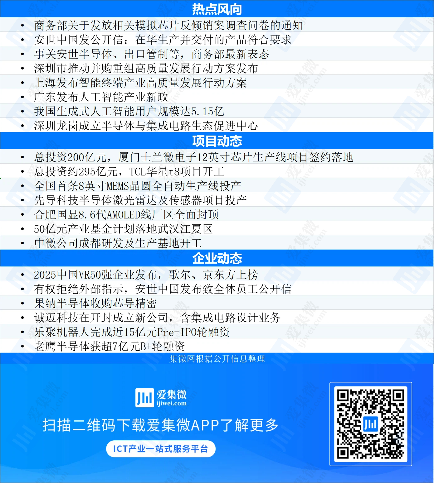 本周以来,安世中国发公开信;深圳市推动并购重组高质量发展行动方案发布;厦门士兰微电子12英寸芯片生产线项目签约;TCL华星t8项目开工;合肥国显8.6代AMOLED线厂区全面封顶;全国首条8英寸MEMS晶圆全自动生产线投产;果纳半导体收购芯导精密;乐聚机器人完成近15亿元Pre-IPO轮融资......