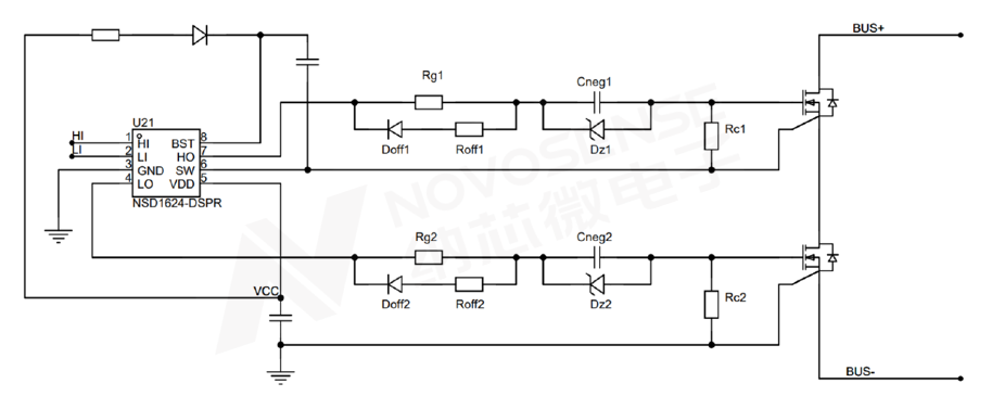 这种负压生成电路正常发波便能够使SiC MOSFET负压关断,自然地便可以用于低成本的自举供电。一个经典的通过自举方式便能够在高低边产生负压的拓扑如下图所示: