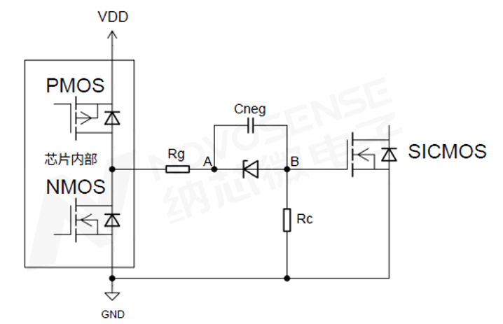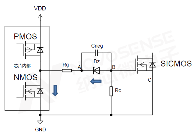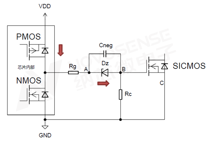 在芯片内部置高时,内部PMOS将芯片VDD短接至芯片OUT。此时如下图3,VDD通过驱动电阻Rg、稳压管Dz与控制电阻Rc线路形成电流。此时Dz需要维持其在该电流下的钳位电压,Cneg的B-A间将形成负压Vneg,SiC MOSFET的栅极电压值则为VDD-|Vneg|。