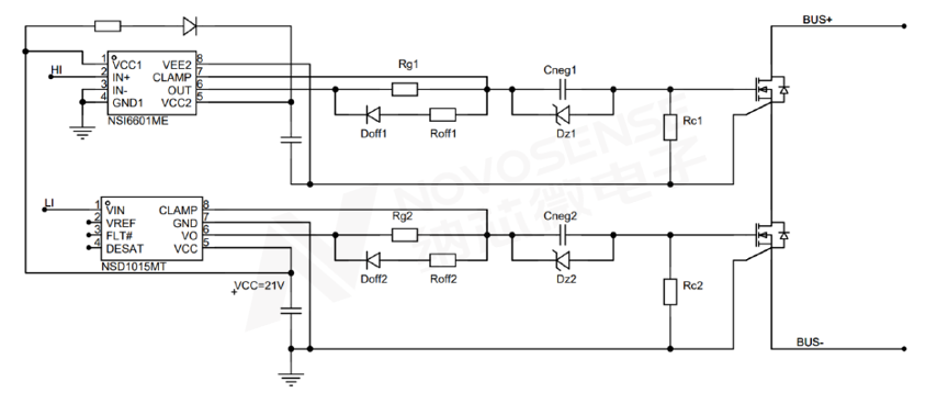 下图7展示了使用纳芯微低边驱动芯片NSD1015MT与隔离驱动芯片NSI6601ME芯片组合而成的半桥拓扑的典型驱动电路,该电路将有源米勒钳位引脚连接到稳压二级管的阳极,从而与负压生成电路叠加使用,可最大程度实现SiC MOSFET的可靠关断,并适用于各类反激、半桥、全桥等电源拓扑。