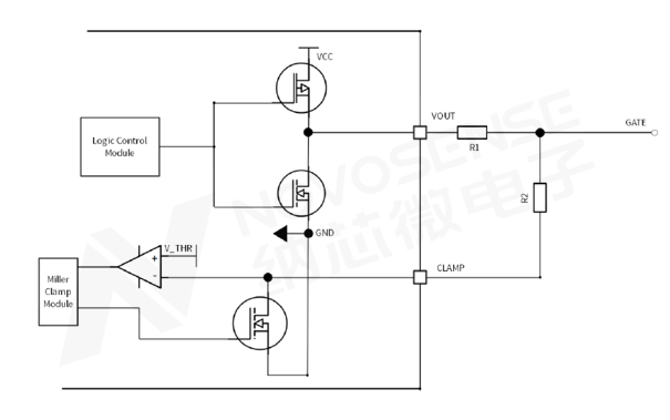 而有源米勒钳位功能原理如下图6,芯片判断出本管闭合状态下(监测CLAMP与VEE管脚间电压低于V_THR),会将栅极驱动电阻R1通过内部MOS短路,使得SiC MOSFET栅极的GS间阻抗极大降低,最终使浪涌电流造成的栅极电压摆幅明显降低。