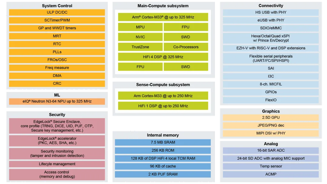 对于深度学习算法部分,芯片中集成的eIQ Neutron Neural Processing Unit (NPU) 提供了强大的算力支持 (41.6 G),能够在极短时间内完成复杂模型的推理计算。在典型的机器学习应用场景中,与传统的AIm Cortex-M33处理器相比,eIQ Neutron NPU在运行模式有极高的推理性能,同时显著减少了能耗。例如,在推理典型的卷积网络(二维卷积)时,NPU的能耗是Cortex-M33的1/106。而对于非深度学习的算法部分,以及驱动NPU的工作,则由Cadence Tensilica HiFi 4 DSP完成。