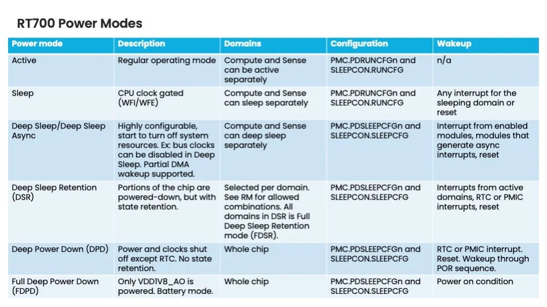 此外,i.MX RT700还配备多种低功耗模式,如下表所示: