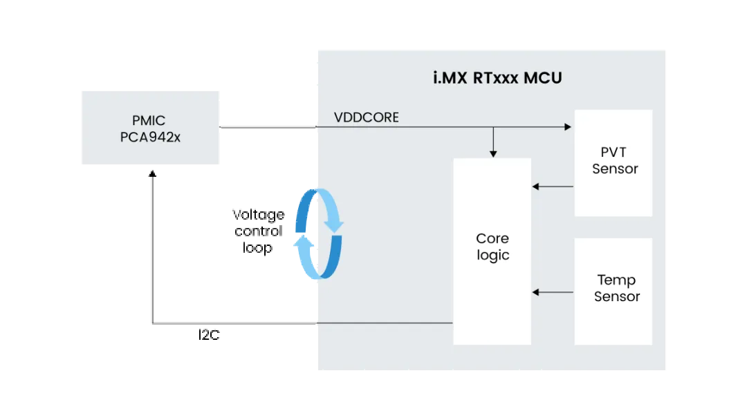 除此之外,i.MX RT700芯片内置了PVT传感器 (Process, Voltage, Temperature),它可以提供一种针对不同芯片动态调压的方案。芯片在运行过程中会受到制造工艺差异、电压波动和温度变化的影响。PVT传感器实时监测这些因素,并通过延迟线结构判断当前供电电压是否足以支撑逻辑运算。如果电压过低,它会触发报警,提示系统提升电压;如果条件允许,系统则可以逐步降低电压,直到找到当前环境下的“最低可用电压”。