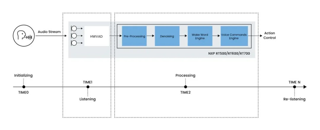 监听阶段可仅保留感知域中的DMA和MICFIL (PDM Microphone Interface) 以较低的频率工作。MICFIL包含HWVAD (Hardware Voice Activity Detector) 功能,从硬件层面检测语音活动。