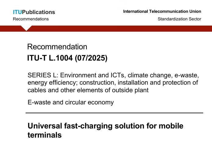 泰尔终端实验室表示,这是 ITU 首次制定的全球通用快速充电标准。其中方案的最佳实践部分,我国自主创新的快速充电方案作为全球的唯一的案例被推荐。中国通信标准化协会(CCSA)和电信终端产业协会(TAF)的双编号团体标准 [T / CCSA 668|T / TAF 266-2025];[T / CCSA 394|T / TAF 092-2024] 在参考文献中被引用。