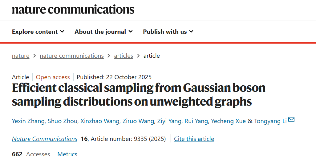 北大计算机学院李彤阳团队在《自然-通讯》发表可模拟高斯玻色采样的高效经典采样算法