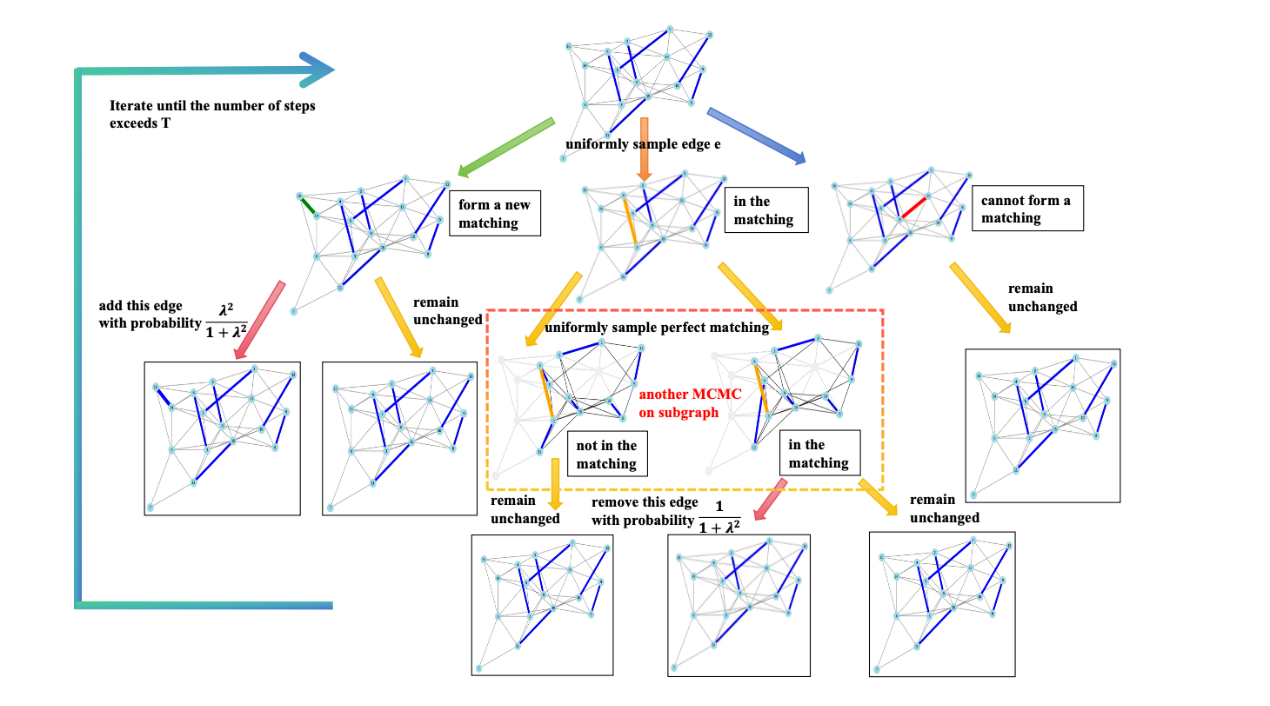 针对这一问题,李彤阳课题组聚焦无权图这一具有重要理论意义的场景,提出了双循环Glauber动力学(Double-loop Glauber Dynamics)算法。该算法在传统马尔可夫链采样的外层迭代中,引入内层链在导出子图上近似均匀地采样完美匹配,从而将采样分布的权重从与hafnian成正比提升至与hafnian的平方成正比,实现了与高斯玻色采样分布的精确对齐。