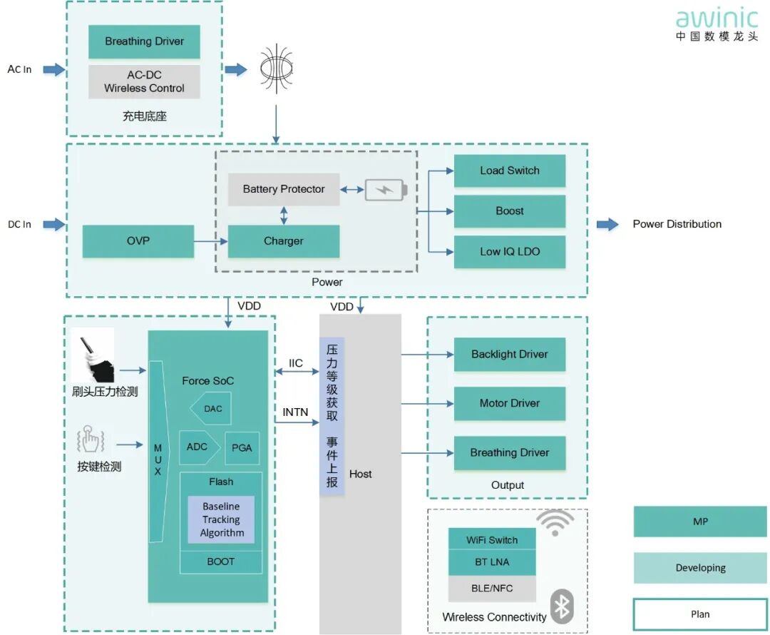 SOC方案可采用AW86803QNR。借助芯片的60K flash,客户可进行方案集成。压力识别模块不再需要额外主控,直接实现压力及按键的检测。还能根据实际需求外接马达驱动芯片,当刷头力度超标或按键触发时即可立即控制马达反馈,开发效率直接拉满。